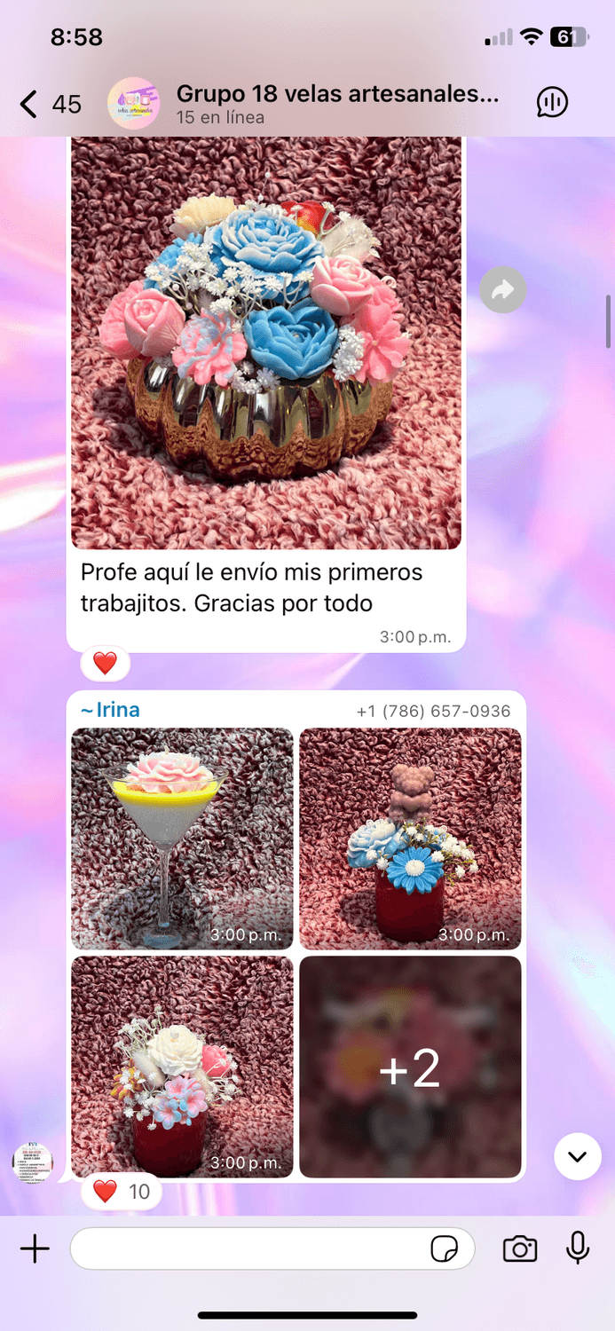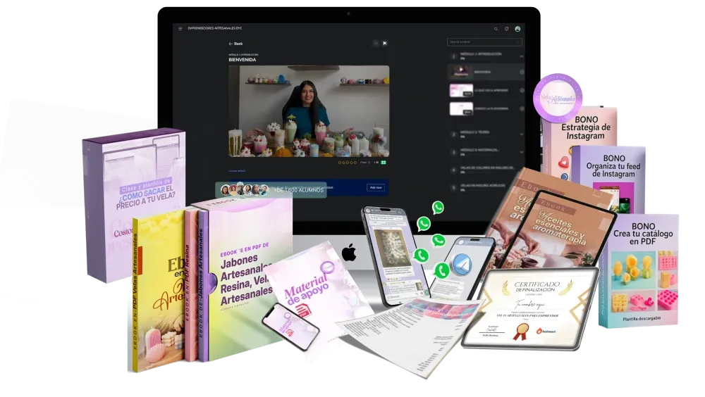 Más de 150 clases en video y más de 15 horas de contenido práctico donde aprenderás desde cero a crear, diseñar y vender tus propias velas como una experta.